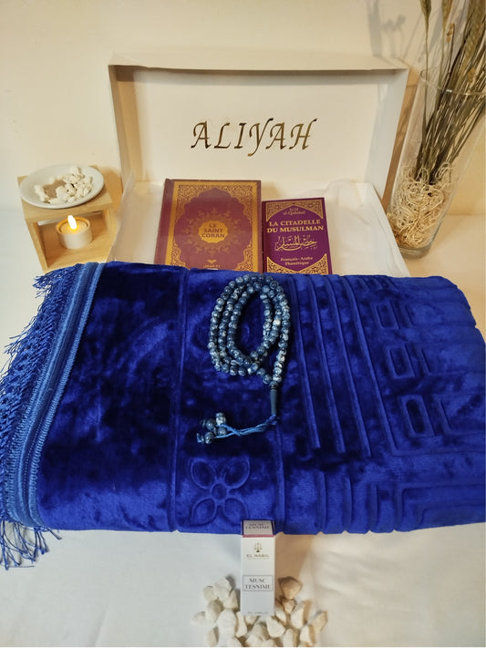 Coffret prière personnalisé confort femme le Saint Coran la citadelle du musulman le tapis de prière personnalisable un musc tesnime et un tasbih islamique
